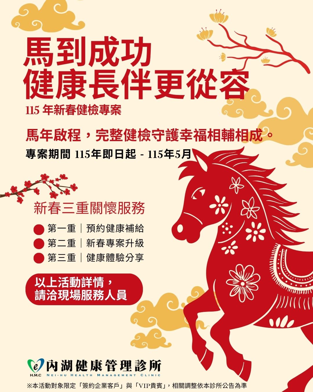 新的一年, 把關心自己與摯愛, 化為最實際、也最溫柔的行動 每一次檢查, 都是重新與身體對話的機會。 為自己、為家人、為重要的人, 在新春之際完成一次完整守護。 專案內容 第一重|預約健康補給 第二重|新春專案升級 第三重|健康體驗分享 適用對象|簽約企業客戶 & VIP貴賓 活動期間|115年即日起-115年5月 名額有限,敬請把握預約時機! 想了解更多健康禮遇,歡迎洽詢現場服務人員 ※本診所保留隨時修改、變更、暫停或終止活動內容之權利,以公告為準