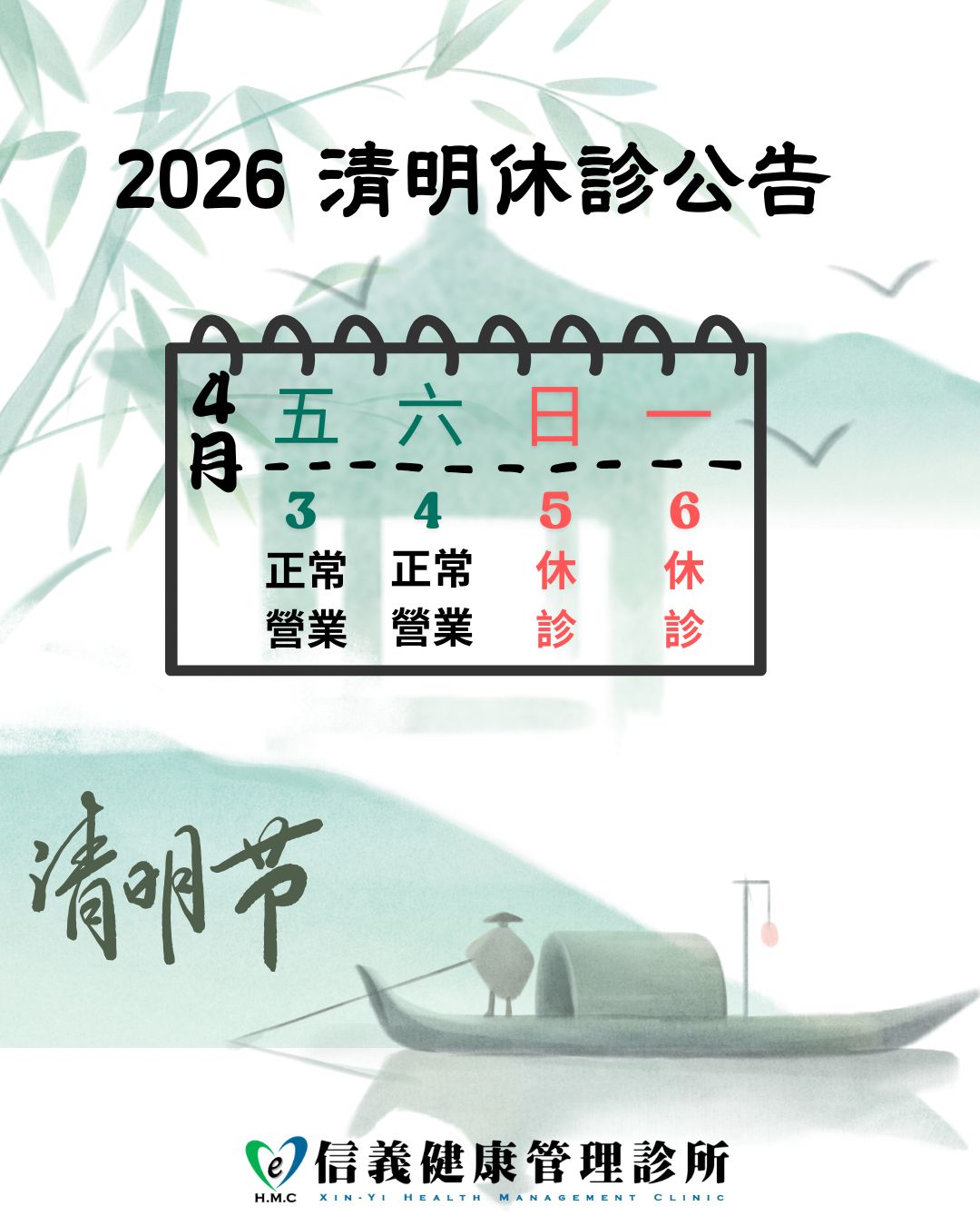 【2026清明休診公告】 本診所將於 4/5(日) - 4/6(一) 休診二日。 如有不便,敬請見諒! 祝大家連假平安順心! 如需服務請來信留下您的問題,我們將於4/7(二)上班時間儘速回覆您的訊息。 xinyi101hmc@tach.com.tw